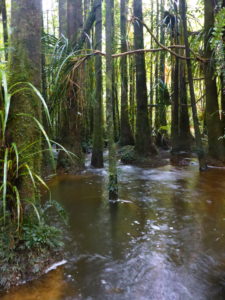 Pristine kahikatea swamp forest on the Mimi River in Taranaki. Home to giant kōkopu, banded kōkopu, redfin bully and longfin eel.
